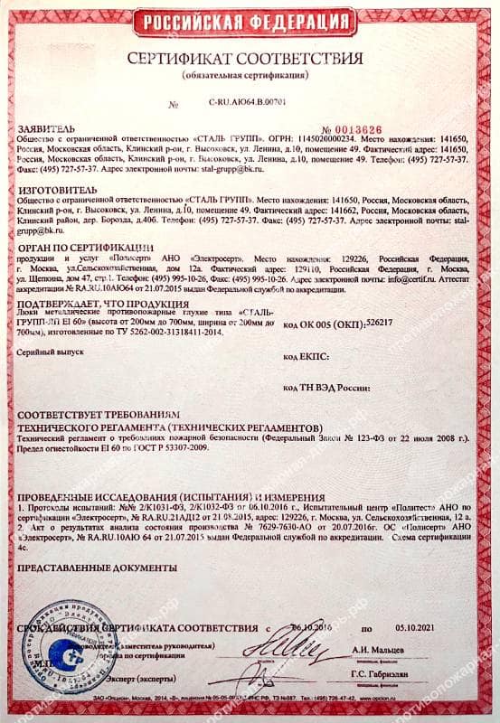 Полученный сертификат подтверждает, что противопожарные люки соответствуют «Техническому регламенту требований пожарной безопасности» (Федеральный Закон № 123-ФЗ от 22 июля 2018 года) и дает право компании «СТАЛЬ-ГРУПП» выпустить люки EI 60 в серийное производство.